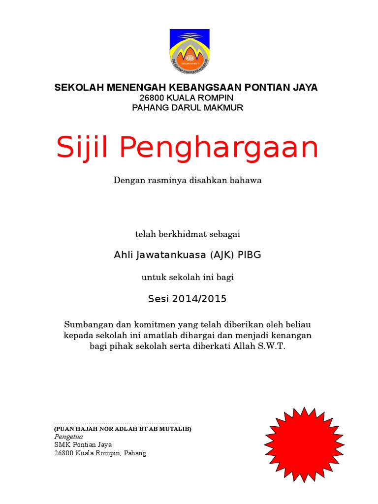 Contoh Sijil Penghargaan Pibg Pdf
